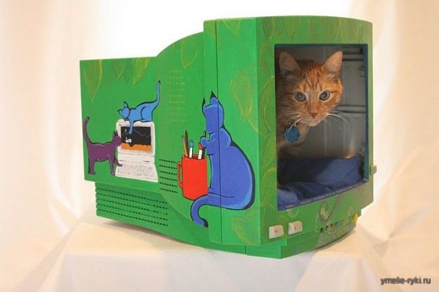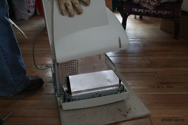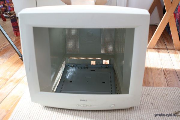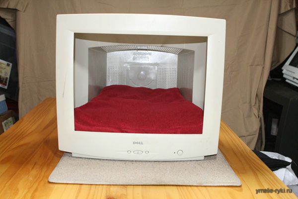 Такой монитор не обойдется вам в крупную денюшку. Возможно он кроется у вас в гараже или у знакомых. Старому ненужному ЭЛТ монитору можно подарить новую жизнь. Сделав из него стильный дом для кошки своими руками. Выглядит стильно и интересно, да животному он точно понравится. Для работы вам нужны будут такие вещи: Отвертки; Перчатки; Кусачки для проводов; Коробка; Журналы или бумага; Ткань и синтипон для удобства кота или кошки; И сам монитор) Инструкция проста: 1. Положите монитор экраном вниз, для его разборки. Выкрутите болты, которые вы видите и отложите их в сторону, они еще понадобятся при сборке. Затем снимаете подставку. В конце следует разъединить все защелки удерживающие две части монитора вместе.