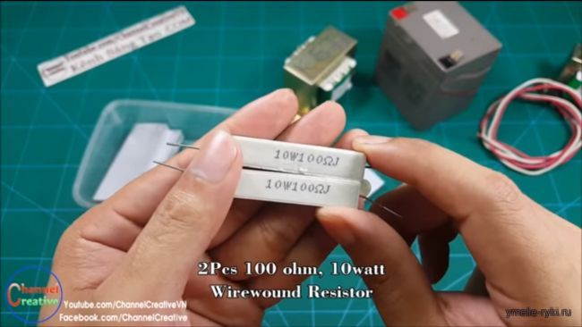 Берем два резистора на 100 Ом и соединяем два контура по диагонали. То есть, контакты вам нужно припаять к двум крайним левым ножкам транзисторов, если смотреть на их лицевую часть.
