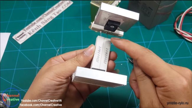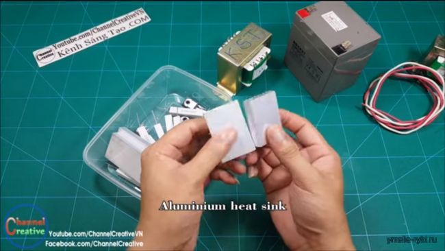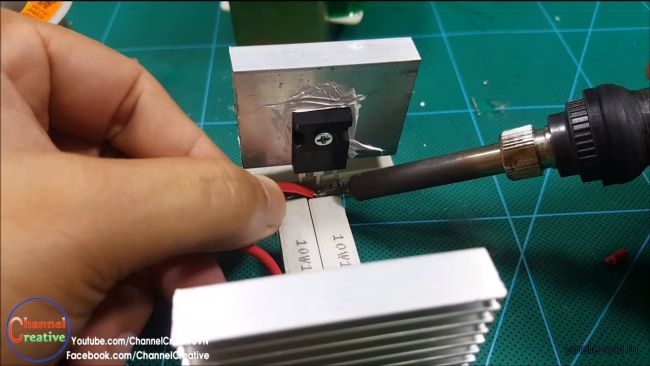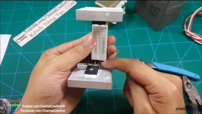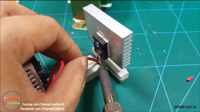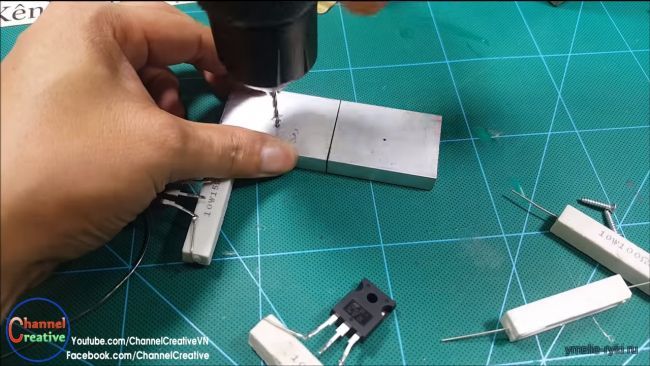 При работе транзисторы будут греться, и если не отводить это тепло, они могут выйти из строя. Тут вам понадобится два радиатора. Сверлим отверстия, наносим термомпасту и хорошенько притягиваем транзисторы к радиаторам саморезами.