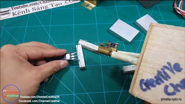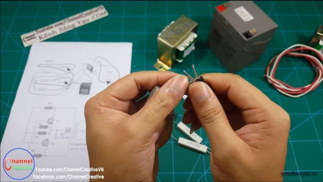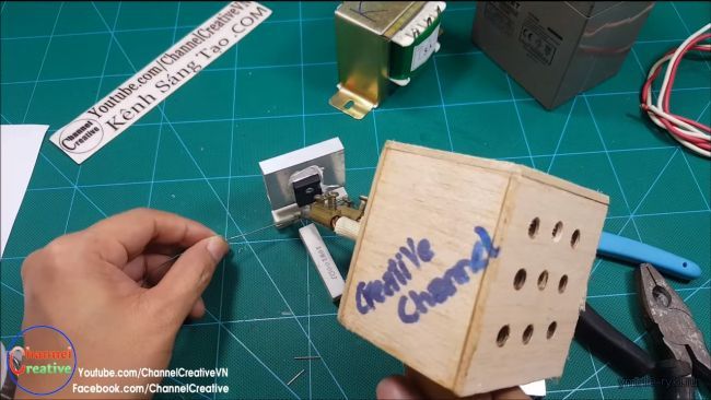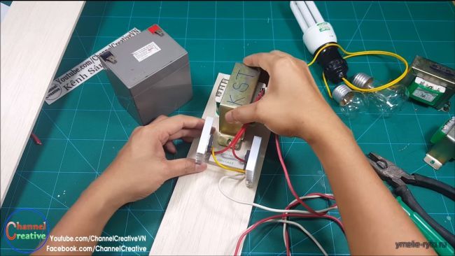 Чтобы все было безопасно и выглядело эстетично, сделаем для инвертора корпус! Для этого вам понадобится розетка, кусок кабеля, а также фанера, ламинат или что-то подобное. Нарезаем материал до нужных кусков, чтобы сделать короб. К основе прикручиваем трансформатор, для надежности автор решил прикрутить его винтами с гайками. Что касается электронной части с транзисторами, ее было принято решение закрепить пластиковыми стяжками. Сверлим отверстия и притягиваем нижние резисторы на 100 Ом к основе.