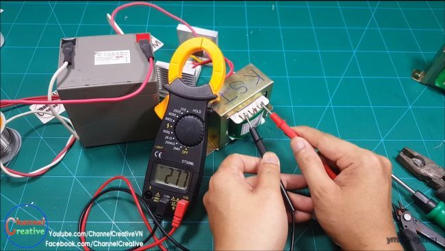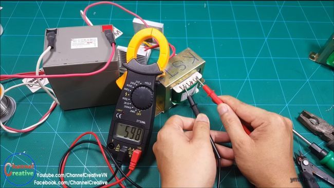 Оглянуться не успели, как электронная часть инвертора собрана, можно тестировать! Подключаем аккумулятор и мультиметром замеряем напряжение. Оно скачет в диапазоне 200-500В.