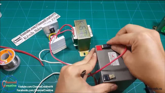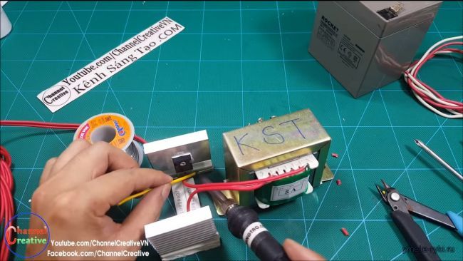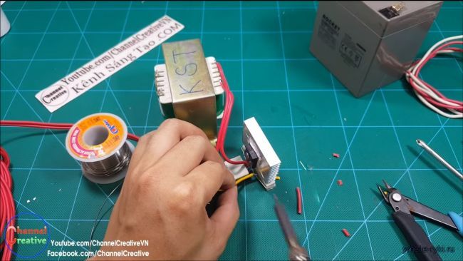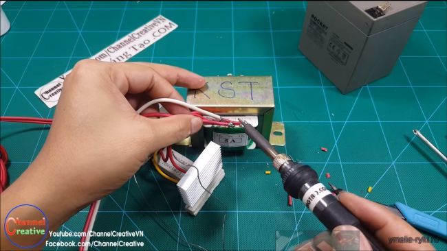Берем еще один кусок провода, у автора он розового цвета. Припаяйте его к центральному контакту трансформатора, через него на трансформатор будет подаваться плюс от аккумулятора.