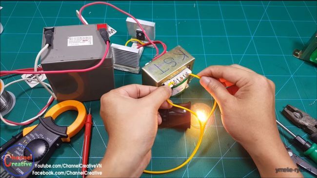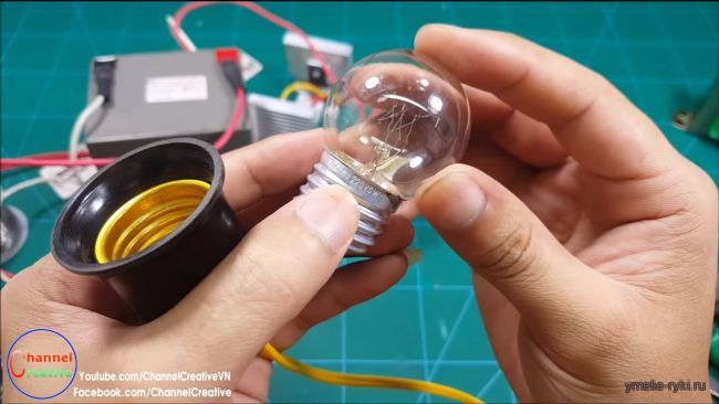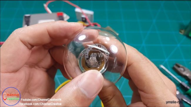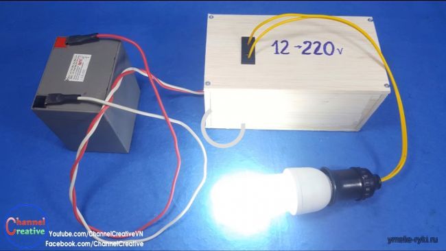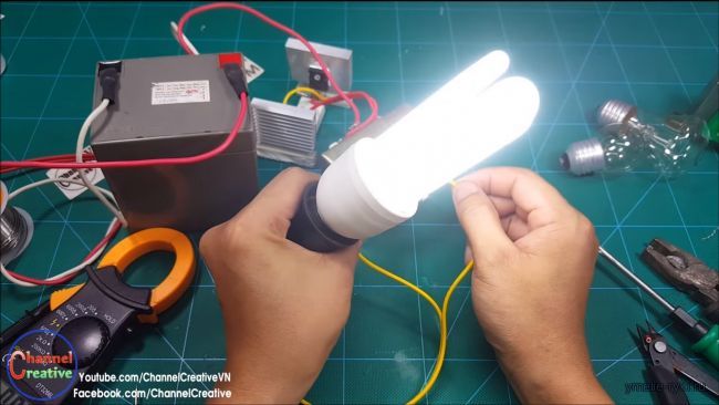Сперва автор решил подключить очень слабенькую лампочку на 5 Ватт к инвертору, она загорелась без проблем.