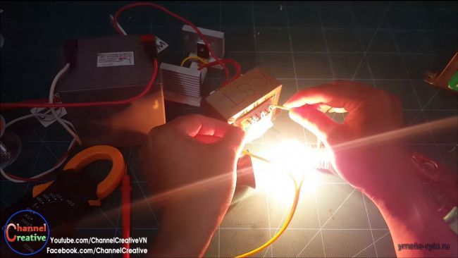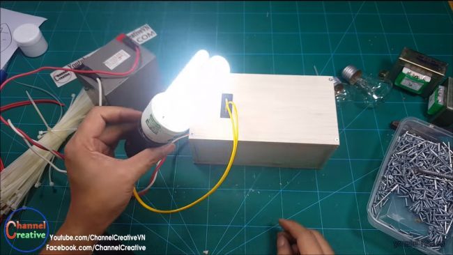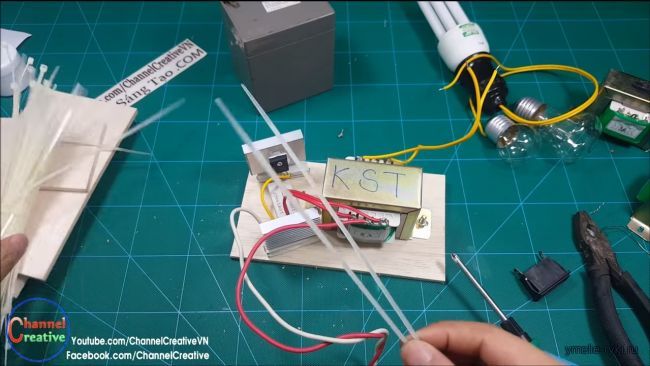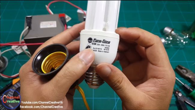В завершении автор решил подключить лампу дневного света на 15Ватт, она также загорелась без особых проблем.