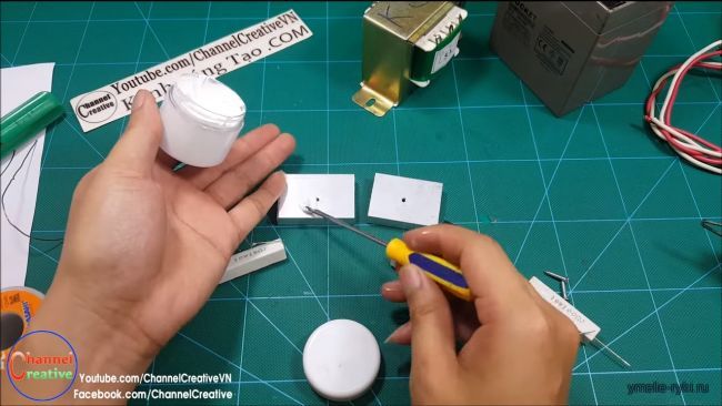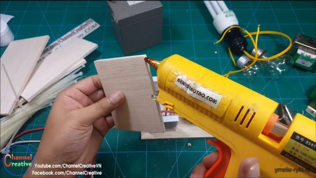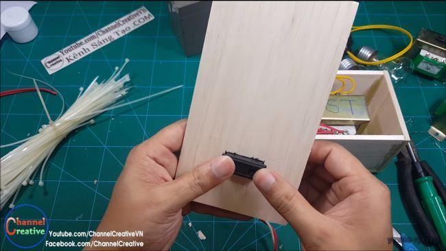 Корпус можно собирать, для этих целей автор использовал горячий клей. Что касается верхней крышки, то в ней нужно вырезать посадочное место под розетку. У автора материал мягкий, он вырезает окно с помощью канцелярского ножа. Если окно подходящего размера, розетка должна зафиксироваться надежно. С обратной стороны ее можно дополнительно укрепить горячим клеем или эпоксидкой.