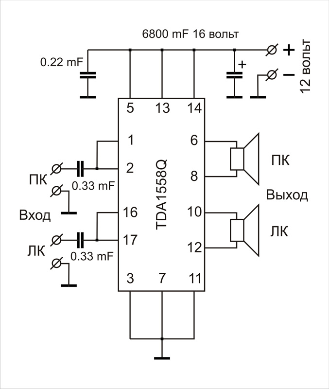 Усилитель мощности на микросхеме TDA1558Q. Этот усилитель имеет выходную мощность 2 Х 22 ватта и достаточно прост для повторения начинающими радиолюбителями. Такая схема пригодится Вам для самодельных колонок, или для самодельного музыкального центра, который можно сделать из старого MP3 плеера. Для его сборки понадобится всего пять деталей: 1. Микросхема - TDA1558Q 2. Конденсатор 0.22 мкФ 3. Конденсатор 0.33 мкФ – 2 штуки 4. Электролитический конденсат
