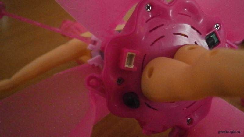 Открыв упаковку я внимательно изучила содержимое. На самой кукле есть некий разъем, он же предназначен для зарядки. Тут же я нашла кнопку для включения и выключения. Еще на на ей находятся приемник и передатчик по всей видимости инфракрасных лучей, что и позволяет, как ранние мной упоминалось, дистанционно при помощи ладошки управлять полетами куклы-феи.