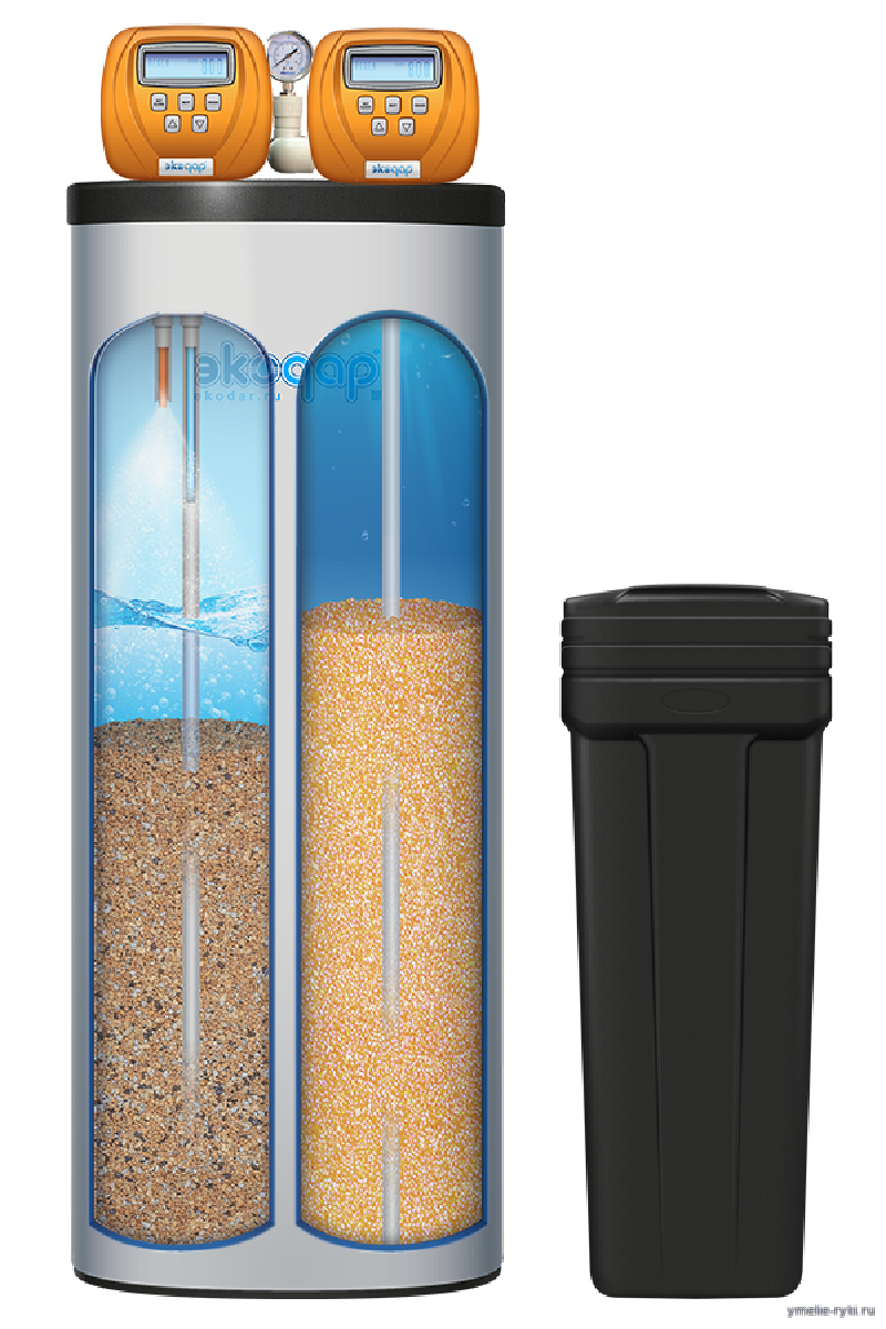 Жесткая вода содержит высокий уровень солей жесткости, которые образуют заметный налет в чайниках, посуде для приготовления пищи, в смесителях, трубах, стиральных машинах, насосах, способствуя быстрому выводу их из строя. Для очистки от примесей используется система смягчения воды, в которую входит фильтр c поликомпонентной ионообменной эко-смолой Ekodar Doublesoft, понижающий уровень солей магния и кальция, УФ-лампа для обеззараживания от бактерий, фильтр тонкой очистки. Принцип работы ионообменного смягчителя заключается в замене ионов кальция и магния на ионы натрия при прохождении жидкости через фильтр.