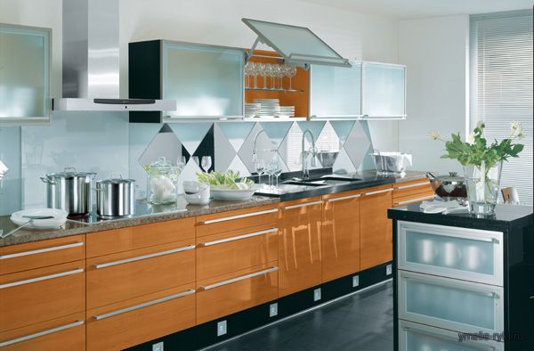 Чтобы их сделать используют как массивы древесины (для кухонь, например, класса премиум), так и фасады из МДФ – древесноволокнистая плита, облицованная шпоном. Не надо думать, что это плохо. Наоборот – это революция в мебельном производстве. Значительное удешевление мебели при очень плотной и прочной поверхности, почти как у натурального дерева. А также применение акриловых материалов. Для кухонной мебели все это очень важно. Она подвергается изменениям температур и влажности, но должна много лет выглядеть хорошо