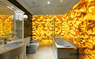 Кстати, оникс хорошо пропускает свет. Поэтому если есть желание усилить эффект, можно сделать подсветку камня с внутренней стороны. Для этого потребуется плитка толщиной не более 6 см. Теплое, мягкое, приглушенное сияние подсвеченного камня создаст атмосферу уюта и спокойствия в ванной комнате.